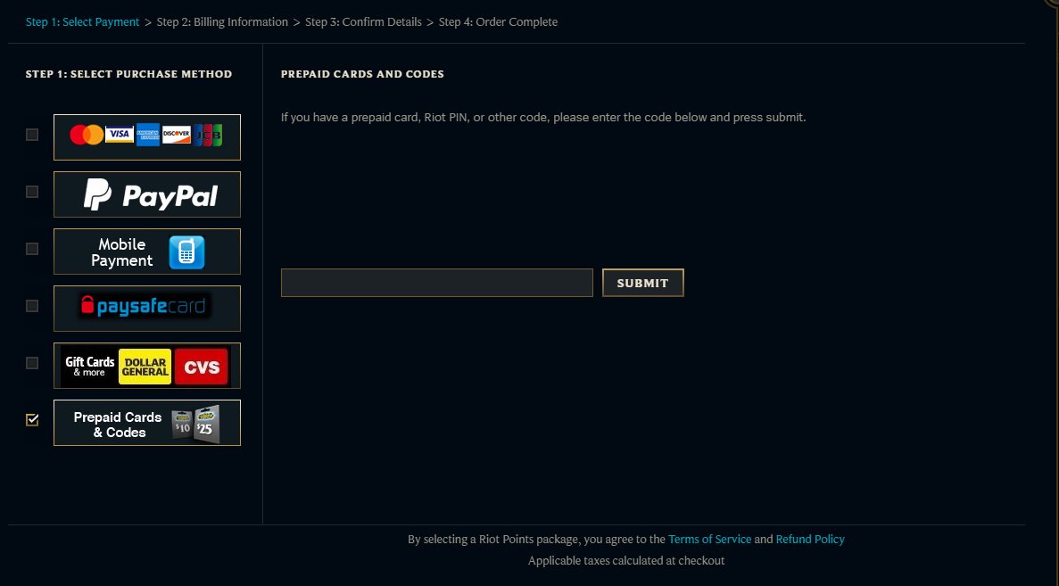 While there are direct methods of purchase, you can also opt to purchase them with prepaid riot points (rp). You have to go to gamestop and use that gift card to buy a riot games rp code card. 00 199.99 $199.99 free shipping by amazon I'm aware you can do that, that is blatantly obvious. These cards are region locked, so please note that even if you purchase a card through amazon, it will not be.